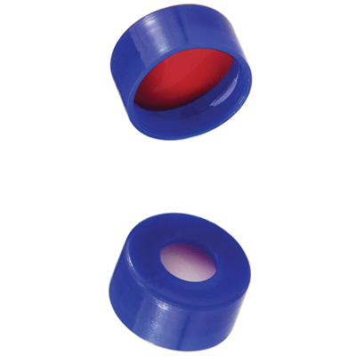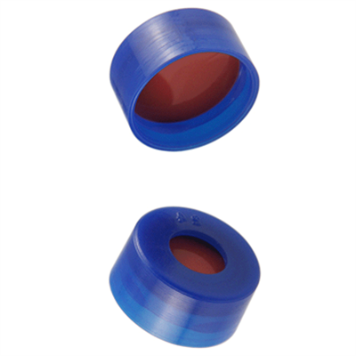 Caps, Snap Top, with Soft-Guard, White Silicone Rubber / Red PTFE Septa, fitted in smooth, polyethylene, Blue Caps. For use with 11mm, 12x32mm Snap Top autosampler vials. Soft-Guard Brand. 100/PK.
