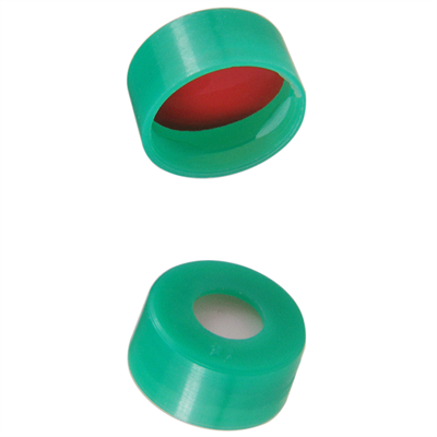 Caps, Snap Top, with Soft-Guard, White Silicone Rubber / Red PTFE Septa, fitted in smooth, polyethylene, Green Caps. For use with 11mm, 12x32mm Snap Top autosampler vials. Soft-Guard Brand. 1000/CS.
