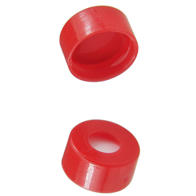 Caps, Snap Top, with Soft-Guard, White Silicone Rubber / Red PTFE Septa, fitted in smooth, polyethylene, Red Caps. For use with 11mm, 12x32mm Snap Top autosampler vials. Soft-Guard Brand. 100/PK.