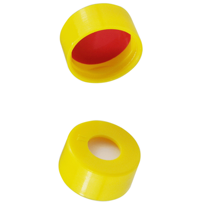 Caps, Snap Top, with Soft-Guard, White Silicone Rubber / Red PTFE Septa, fitted in smooth, polyethylene, Yellow Caps. For use with 11mm, 12x32mm Snap Top autosampler vials. Soft-Guard Brand. 100/PK.