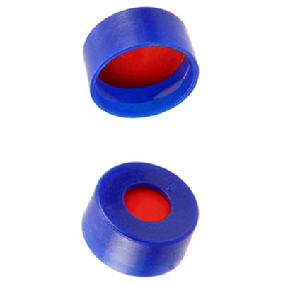 Caps, Snap Top, with 1.0mm thick, Red Rubber / Beige PTFE Septa, fitted in smooth, soft polyethylene, Blue Caps. For use with 11mm, 12x32mm Snap Top autosampler vials. MICROSOLV Brand. 100/PK.