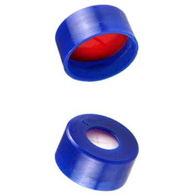 Caps, Snap Top, with Red PTFE / White Silicone Rubber / Red PTFE Septa, fitted in smooth, polyethylene, Blue Caps. For use with 11mm, 12x32mm Snap Top autosampler vials. MICROSOLV Brand. 100/PK.