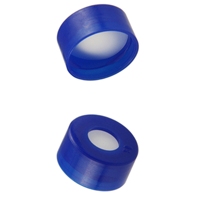 Caps, Snap Top, with White Silicone Rubber / Tan PTFE Septa, fitted in smooth, polyethylene, Blue Caps. For use with 11mm, 12x32mm Snap Top autosampler vials. AQ Brand. 100/PK.