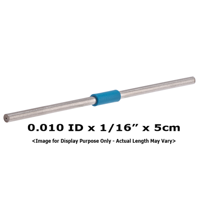 Tubing, Stainless Steel, Pre-Cut, 0.010 inch (0.25 mm) ID, 1/16 inch (1.60 mm) OD, HPLC grade, blue band, 5 cm long. ARE-Applied Research brand. 1 EA.