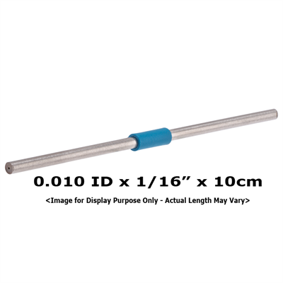 Tubing, Stainless Steel, Pre-Cut, 0.010 inch (0.25 mm) ID, 1/16 inch (1.60 mm) OD, HPLC grade, blue band, 10 cm long. ARE-Applied Research brand. 1 EA.