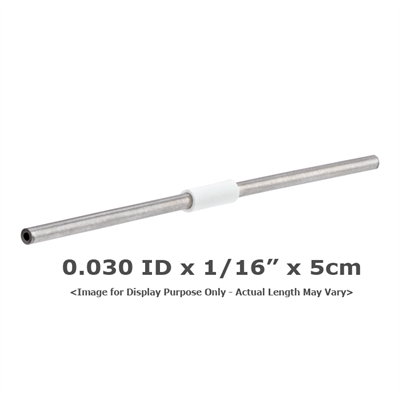 Tubing, Stainless Steel, Pre-Cut, 0.030 (0.75 mm) inch ID, 1/16 inch (1.60 mm) OD, HPLC grade, white band, 5 cm long. ARE-Applied Research brand. 1 EA.