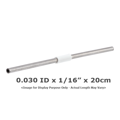 Tubing, Stainless Steel, Pre-Cut, 0.030 (0.75 mm) inch ID, 1/16 inch (1.60 mm) OD, HPLC grade, white band, 20 cm long. ARE-Applied Research brand. 1 EA.