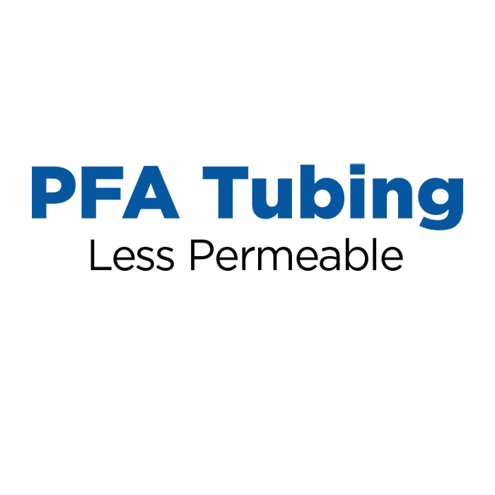 PFA Tubing (PerFlourAlkoxy) - Similar to PTFE but less permeable, is extruded from virgin PFA. We do not add any additives to the original PFA material. PFA tubing and capillaries do not contain micro-pores in the tubing wall to the same extent as PTFE tubing.
