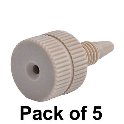 Variety of PEEK fittings that can be finger tightened are available as one or two pieces. The one-piece is very convenient and very common in HPLC labs. Two-piece nuts with double cone ferrules will last longer and give better seals than one-piece PEEK nuts. Maximum temperature 100°C, maximum pressure 6,000 psig.