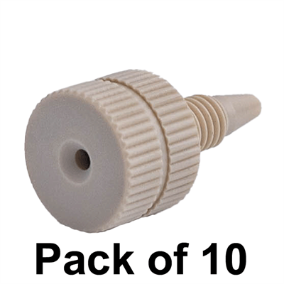 Tubing connector fittings, high pressure, two pieces, 1/16 inch, PEEK, natural, large head, standard length and 10-32 screw threads. Use with double cone ferrules. Finger tighten, ARE-Applied Research brand. 10/PK.