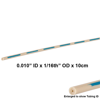 Tubing, PEEK, Pre-Cut, 0.010 inch (0.25 mm) ID, 1/16th inch (1.6 mm) OD, Ultra-T grade, blue intermittent stripes, 10 cm (+/- 1 mm). ARE-Applied Research brand. 5 PK.