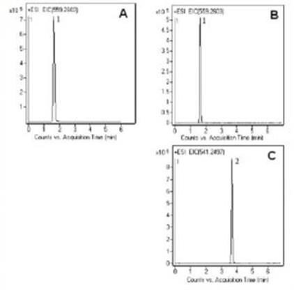 Figure A shows the extracted Ion Chromatogram (EIC) corresponding to Atorvastatin for the Non-Degraded extract. Figures B and C show the EICs of Atorvastatin and the Lactone Degradant respectively for the Acid-Degraded extract.