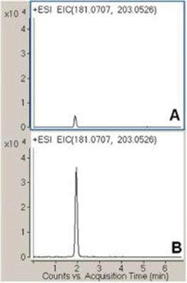Sodium adducts of sugars produce much better signal in LCMS analysis (at least 10 times higher signal for the same sample) – see chromatograms A and B.