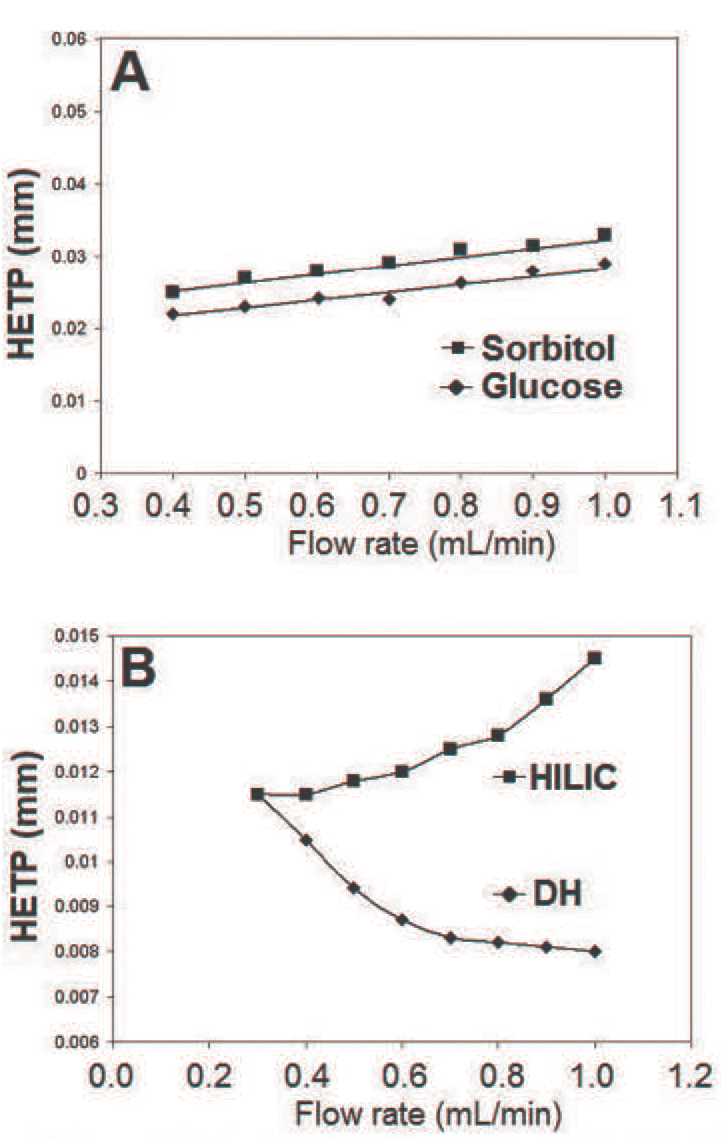Figure A is an excerpt from a study that investigated analyses of Glucose and Sorbitol on TYPE-C Silica based HPLC Columns and found that the efficiency of ANP is better than observed with HILIC. A Cogent Diamond Hydride Column (2.1 x 150mm with a Particle Size of 4µm) was used and Flow Rate v. HETP was plotted as shown. From the plot it is evident that while the Flow Rate is increased by a factor of 2.5 the Efficiency is only slightly lower (~15%).