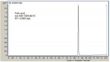A sensitive and reliable Method was developed for the determination of Folic Acid (FA) and can be used in many applications including complex sample matrices without the Solid-Phase Extraction clean up. Since the method uses LC-MS (negative-ion) it provides sensitivity as well as great selectivity. The use of chelating agents or high concentration of salts in the Mobile Phase or Ion Pair Reagents (non MS compatible) are not required as in older methods for FA analysis.