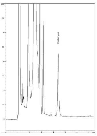 The Stability and Robustness of this Method makes it an excellent choice for QC of this semi-synthetic antibiotic which is structurally related to Lincomycin. The Chromatogram shown below of Clindamycin is from a complex Pharmaceutical Formulation but note the excellent Peak Shape for it and the Separation from the Excipients.