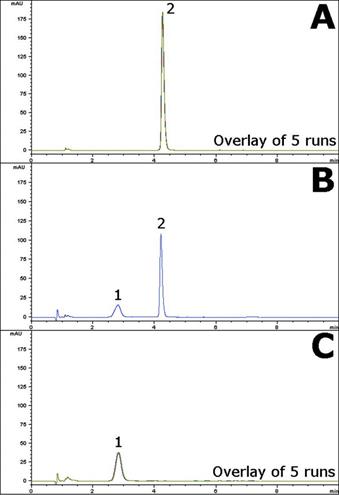 In Figure B, strong acid conditions without heating produced a degradant while the API Peak was still present. In Figure C, acid degradation with heating completely converted the API into the degradant, as the API Peak was no longer observed.