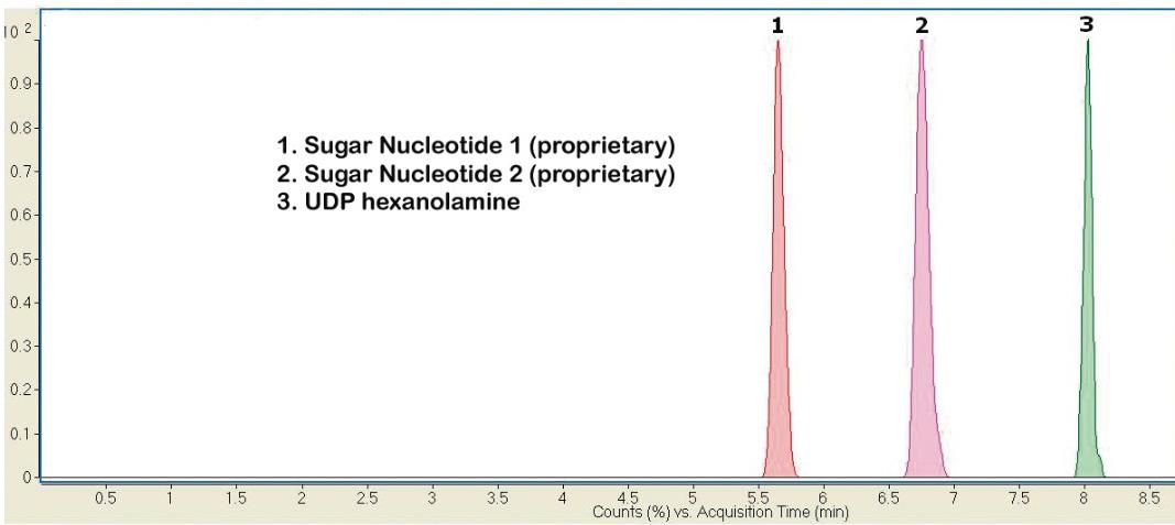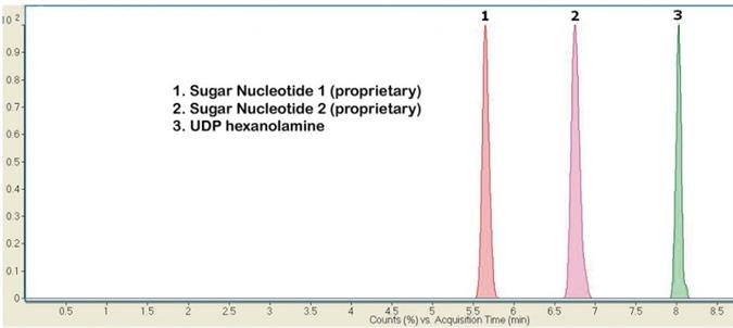 This Method can be used to analyze UDP and CDP Sugars using UDP-Hexanolamine (a metabolite) as an Internal standard. The Sugar Nucleotides used in this Application Note are a mixture of compounds that occur in plants and their structure is proprietary.