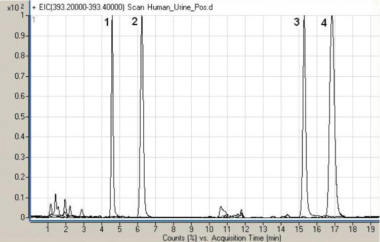 This Method can be used for routine Assays of a Urinary Purine (Hypoxanthine), a Bile Acid (Chenodeoxycholic Acid) and nutrients (Betaine and Choline) in biological fluids. It is very Sensitive due to the high content of the organic component Acetonitrile in the Mobile Phase and the use of “MS friendly” Formic Acid. Very Reproducible with RSD below 0.5% it is also Accurate (MW to 3-4 decimal points).