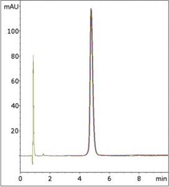 With this Method, Trifluoroacetic Acid is used instead and good Peak shapes are observed, as the five Chromatograms that are overlaid in the Figure show.