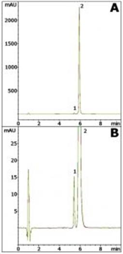 Figure A shows the excellent Precision with five Chromatograms overlayed. Figure B shows a zoom-in view so that the impurity peak can be seen clearly. Another benefit of the Method is that the Mobile Phase is MS compatible.