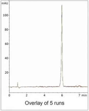 As a highly polar compound, Vancomycin is difficult to retain with Reversed Phase Methods. In this Method the compound retains very well as illustrated in the Figure. In addition, the repeatability of the analysis, which is demonstrated by the overlay of five consecutive runs, is excellent. The Mobile Phase used is LCMS compatible and the low equilibration time after the Gradient allows for a rapid and Robust Analysis.