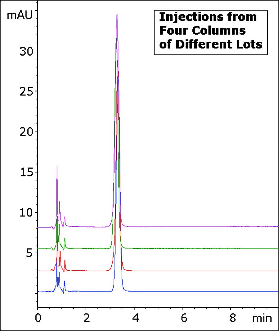 The Method in this Application Note produces an excellent Peak Shape using only Ammonium Acetate as a Mobile Phase Additive. In addition, the Reproducibility and Robustness of this Method is demonstrated through the overlay of four Chromatograms with Columns from four different batches.