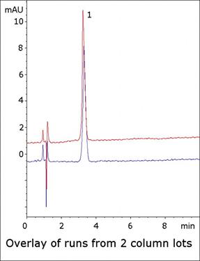 A highly Symmetrical Peak is obtained for the analyte leading to reliable Quantitative Analysis. Injections and Chromatograms using two different lots of Columns illustrate the Reproducibility and Robustness of the Method.
