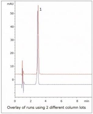 Pyrilamine is a challenging compound to analyze by HPLC because it contains several amine groups that can contribute to peak tailing. In this Method, an excellent Peak shape is obtained for Pyrilamine with a simple isocratic Mobile Phase. Data is shown for two lots of Columns in order to demonstrate the robustness and precision of this Method.