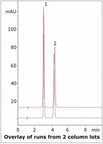Nitrofurantoin can be used as an internal standard to obtain more robust Quantitation. Furthermore, the ability of this Method to distinguish amongst similar compounds demonstrates how it is less prone to interference from impurities or degradants. Two Chromatograms are overlayed to present the precision of the Method using two different Columns made from different lots.