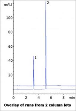 Likewise, a highly organic diluent should be used to adequately extract the compounds from the lip balm material. The figure below shows an overlay of two runs from different Column lots, demonstrating the robustness and precision of the Method.
