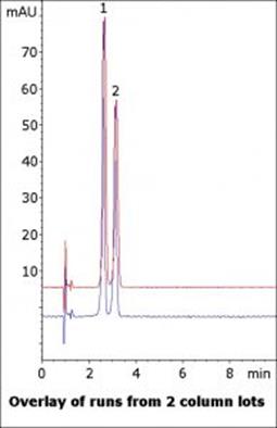 The Method shown here is simple and the Isocratic Mobile Phase is easy to prepare. Baseline resolution is obtained for the two compounds. Furthermore, the Method reproducibility is good, as shown in the figure which uses Columns from two different lots.