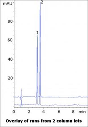 Furthermore, the Separation between these two solutes is good, illustrating the Selectivity capabilities of this Method. Data is shown for two lots of Columns in order to demonstrate the robustness and precision of this Method.