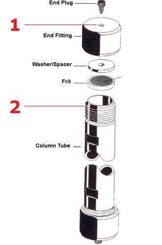 2. The threading that connects the column tube to the end fittings. This varies depending on ID and is 1/4 - 28 for 2mm ID columns, 1/2 - 20 for 4.6mm, and 5/8 - 18 for 7.5mm.