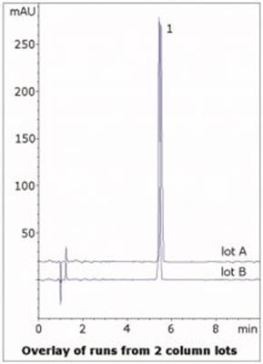 The USP system suitability for the tailing factor is not more than 1.6, and the Peak obtained has a value of 1.1. Data from two Column lots is shown in the figure, demonstrating Robustness of this Method.