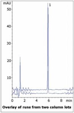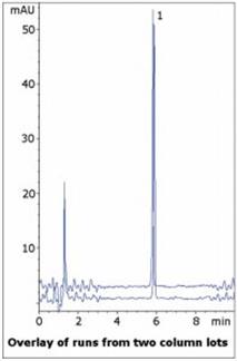 The USP assay Method for Venlafaxine capsules uses Triethylamine and Phosphoric Acid in the Mobile Phase, both of which are incompatible with LC-MS. The system suitability for Venlafaxine tailing factor is 2.0, indicating the compound has a tendency for tailing. Here a sharp symmetrical peak is observed using Formic Acid. Data from two Column lots is shown to illustrate reproducibility.