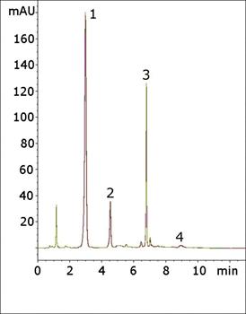 This Method can be used for LCMS applications. Furthermore, the Method's Precision is very good, as the overlay of 5 runs in the Figure below shows. Peak identities were confirmed by individual standards.