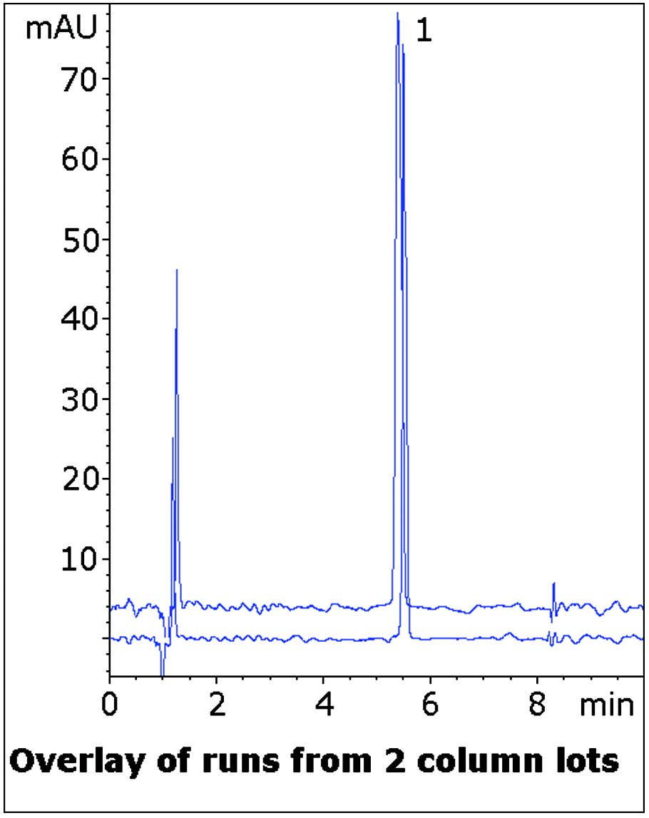 The Method in this Application Note is an improvement over the official USP Method as the Peak produced is very Symmetrical without the use of Ion Pair Agents. Also, the Method is LCMS compatible if transfer is desired. Data from two Column lots is shown to illustrate lot-to-lot consistency of this Method.