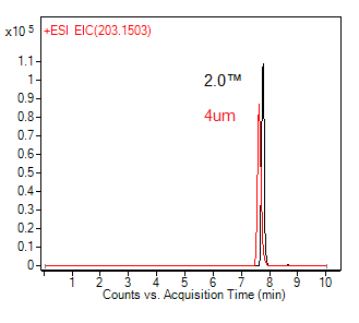 Retention times for ADMA differed only slightly between the 4um and 2.o™ stationary phases. Efficiency however was notably higher when using the 2.o™ phase. This can be readily observed from the greater peak height using the 2.o™ column in the chromatogram overlay comparison shown below: