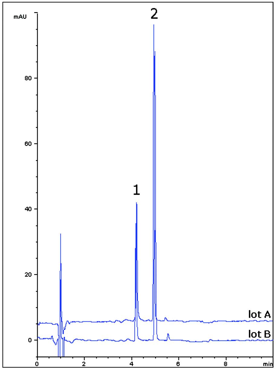 A wavelength change was used in order to make the two peak heights more comparable (there is much more Guaifenesin than Ephedrine in the tablet). Data from two different Column lots is shown in the figure in order to demonstrate the reproducibility of this Method.