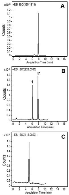 Peaks 1 and 1' have the same mass. 1' is the Peak that corresponds to the Acyclovir formed in the source