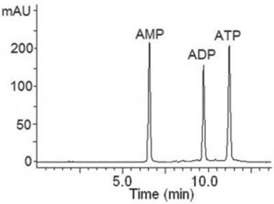 The figure shows a separation of three energy nucleotides. All three are baseline separated in order of increasing polarity as is expected when ANP chromatography is used.