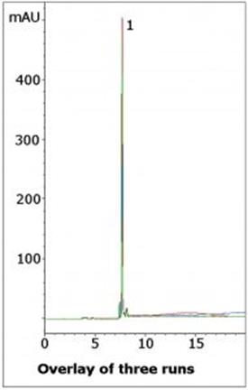 Normal Phase HPLC is well-suited to isomer separations and in this method, separation was observed between the main peak and two smaller peaks. Three runs are shown to illustrate the repeatability, which is often a concern with Normal Phase Methods that use ordinary Silica Columns.