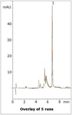 Lansoprazole is separated from several Matrix Components in this simple assay method. The Mobile Phase is LC-MS compatible so the method could be applied to more complex samples such as plasma. Five runs are shown in the figure to illustrate the repeatability of the data.