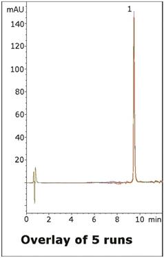 This method for analysis of Indomethacin capsules is easy to perform and uses an LC-MS compatible Mobile Phase. The API peak that was obtained shows excellent efficiency and the data is very reproducible, as illustrated by the overlay of five runs shown in the figure.