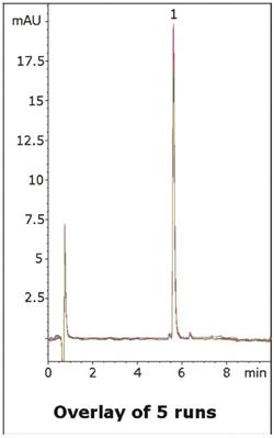 This method for analysis of Hesperidin produces an excellent analyte peak and shows separation from what appears to be two impurity peaks. The gradient method is LC-MS compatible and can be applied to many types of Hesperidin-containing samples such as citrus fruit extracts. The overlay of five runs shown in the figure illustrates the run-to-run reproducibility of the data.