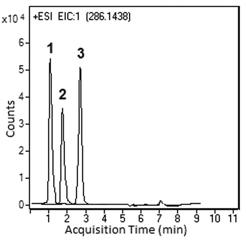Sample Preparation: To a spiked Plasma Sample (1mL), 1mL of an Ammonia solution (0.1% v/v) was added and vortex-mixed for 30 seconds to alkalize the Plasma. Then, the alkalized Plasma Sample was extracted with two 4mL Ethyl Acetate aliquots by vortex for 5 minutes, and centrifuged at 4000 rpm for 8 minutes at room temperature. The supernatant was separated and evaporated to dryness under a gentle stream of Nitrogen. The residue was reconstituted with 200µL Mobile Phase, and a 1µL aliquot of the reconstituted solution was injected into the LC– ESI-MS for analysis.