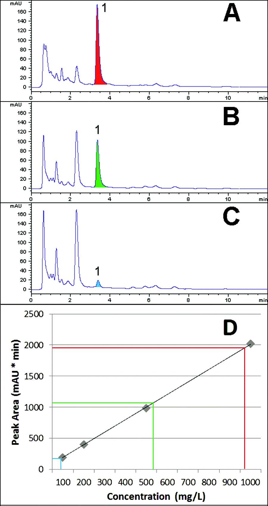 A calibration curve was constructed in the range of 100 – 1000mg / L (Figure D), which provided estimates of caffeine content in the Beverages: Espresso: 964mg / L, Regular Coffee: 539mg / L, and Decaf Coffee: 85mg / L.