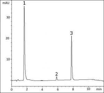 A high UV wavelength of 310 nm was chosen at the beginning of the gradient in order to reduce the Acetaminophen peak height, since this analyte is present in much higher concentration than the other two.