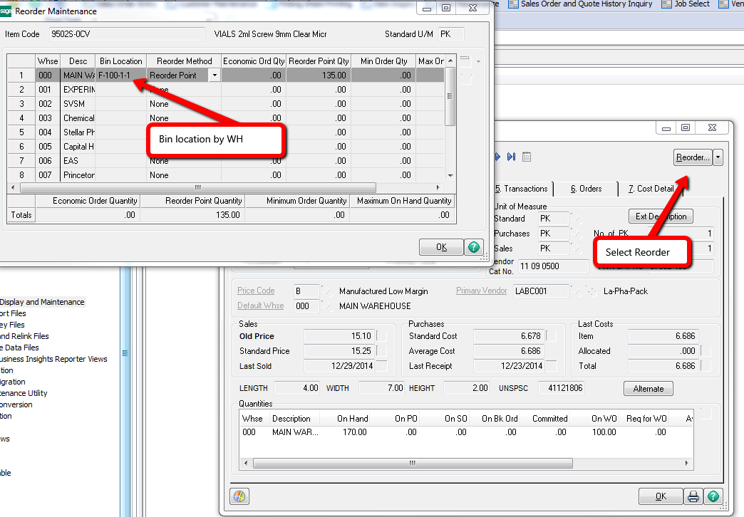 4. Select Reorder Button which will automatically bring you to another screen called Reorder Maintenance. Here is where you can find the Bin locations.